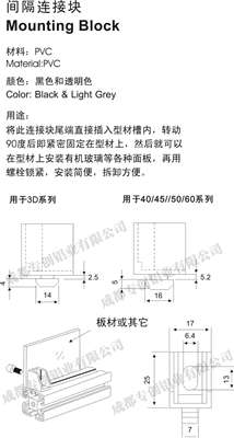 將此連接塊尾端直接插入型材槽內(nèi),轉(zhuǎn)動(dòng)90度后即緊密固定在型材上,然后就可以在型材上安裝有機(jī)玻璃等各種面板,再用螺栓鎖緊,安裝簡便,拆卸方便。